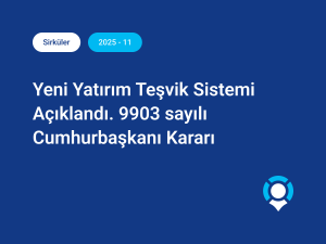 - 05.2025 tarihli ve 32915 sayılı Resmi Gazete’de yayımlanan 9903 sayılı Cumhurbaşkanı Kararı ile yeni yatırım teşvik uygulaması yürürlüğe girmişti. Konu ile ilgili açıklamalara Yeni Yatırım Teşvik Sistemi Açıklandı 9903 sayılı Cumhurbaşkanı Kararı – Atax YMM bağlantısından ulaşılabilecek sirküde yer verilmişti.